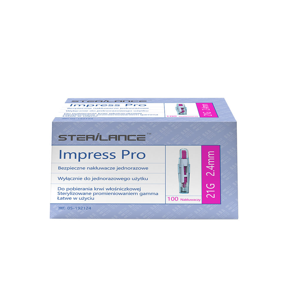 Bezpieczne nakłuwacze jednorazowe 21G; 2,4mm (100 szt.) – produkt jednorazowego użytku przeznaczony do uzyskania próbki krwi kapilarnej z opuszki palca.